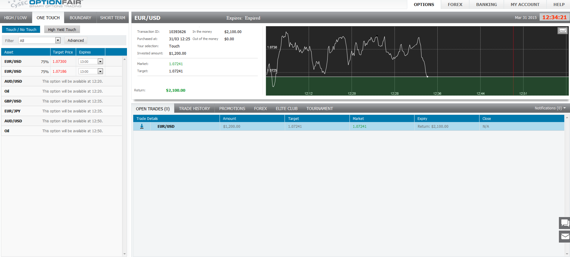 I logged in the OptionFair™ binary options trading platform and I traded $1200 on the "Touch Down" instrument. This kind of option has a return of 75% if the option touches the strike price prior to expiry, which means that if the signal is correct, I could get a return of $900 on my investment.