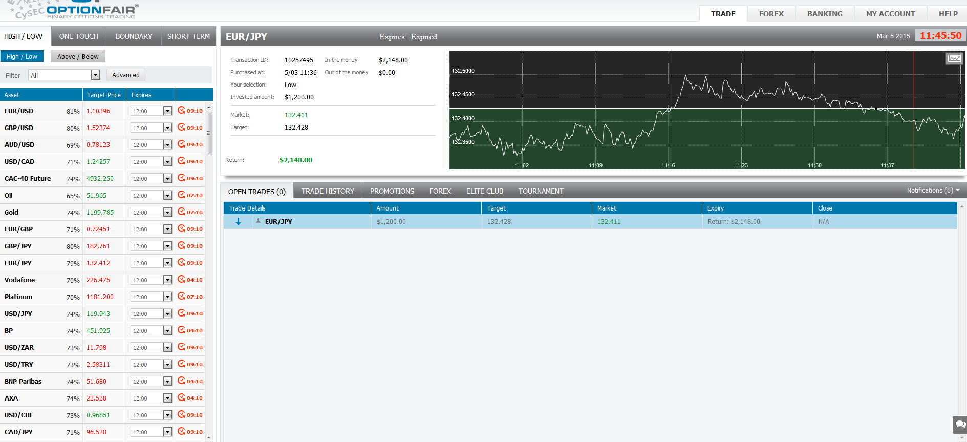 I logged in the OptionFair™ binary options trading platform and I traded $1200 on the "Low" instrument. This kind of option has a return of 79% if the option will close below the target price, which means that if the signal is correct I could get a return of $948 on my investment.