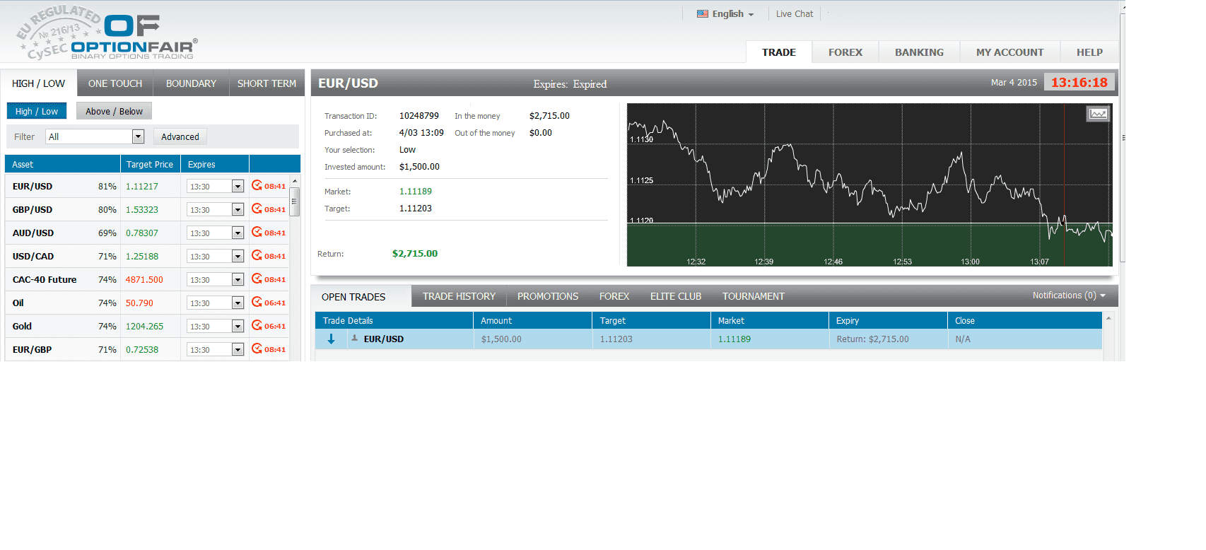 I logged in the OptionFair™ binary options trading platform and I traded $1500 on the "Low" instrument. This kind of option has a return of 81% so if the option will close below the target price, which means that if the signal is correct I could get a return of $1215 on my investment.