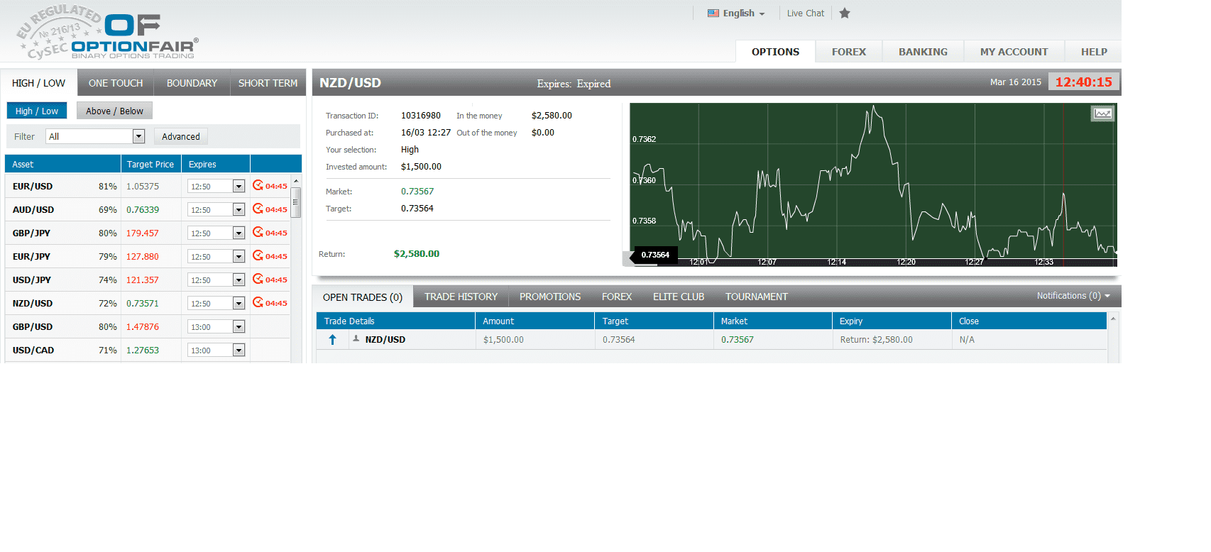 I logged in the OptionFair™ binary options trading platform and I traded $1500 on the "High" instrument. This kind of option has a return of 72% if the option will close above the target price, which means that if the signal is correct I could get a return of $1080 on my investment.