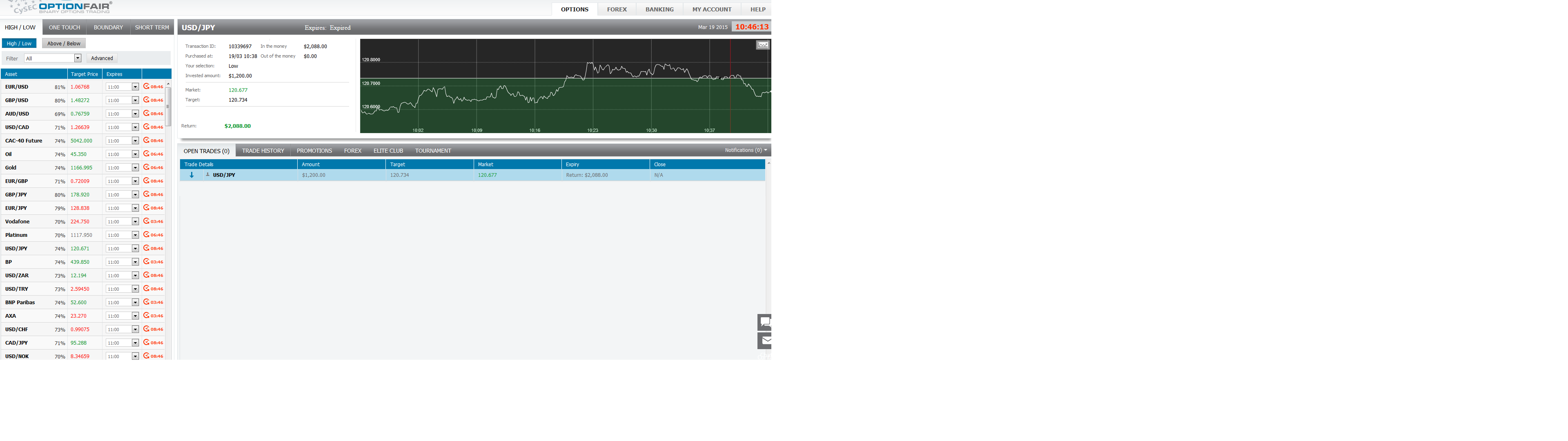 I logged in the OptionFair™ binary options trading platform and I traded $1200 on the "Low" instrument. This kind of option has a return of 74% if the option will close above the target price, which means that if the signal is correct I could get a return of $888 on my investment.