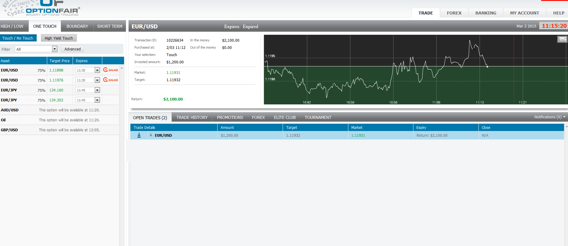 I logged in the OptionFair™ binary options trading platform and I traded $1200 on the "Touch Down" instrument. This kind of option has a return of 75% if the option touches the strike price prior to expiry, which means that if the signal is correct, I could get a return of $900 on my investment.