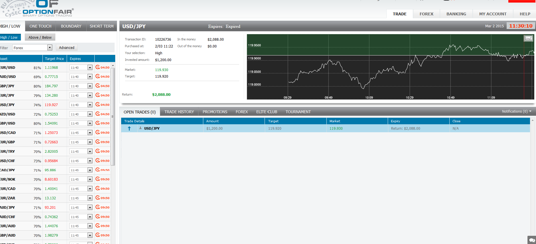 I logged in the OptionFair™ binary options trading platform and I traded $1200 on the "High" instrument. This kind of option has a return of 74% if the option will close above the target price, which means that if the signal is correct I could get a return of $888 on my investment.