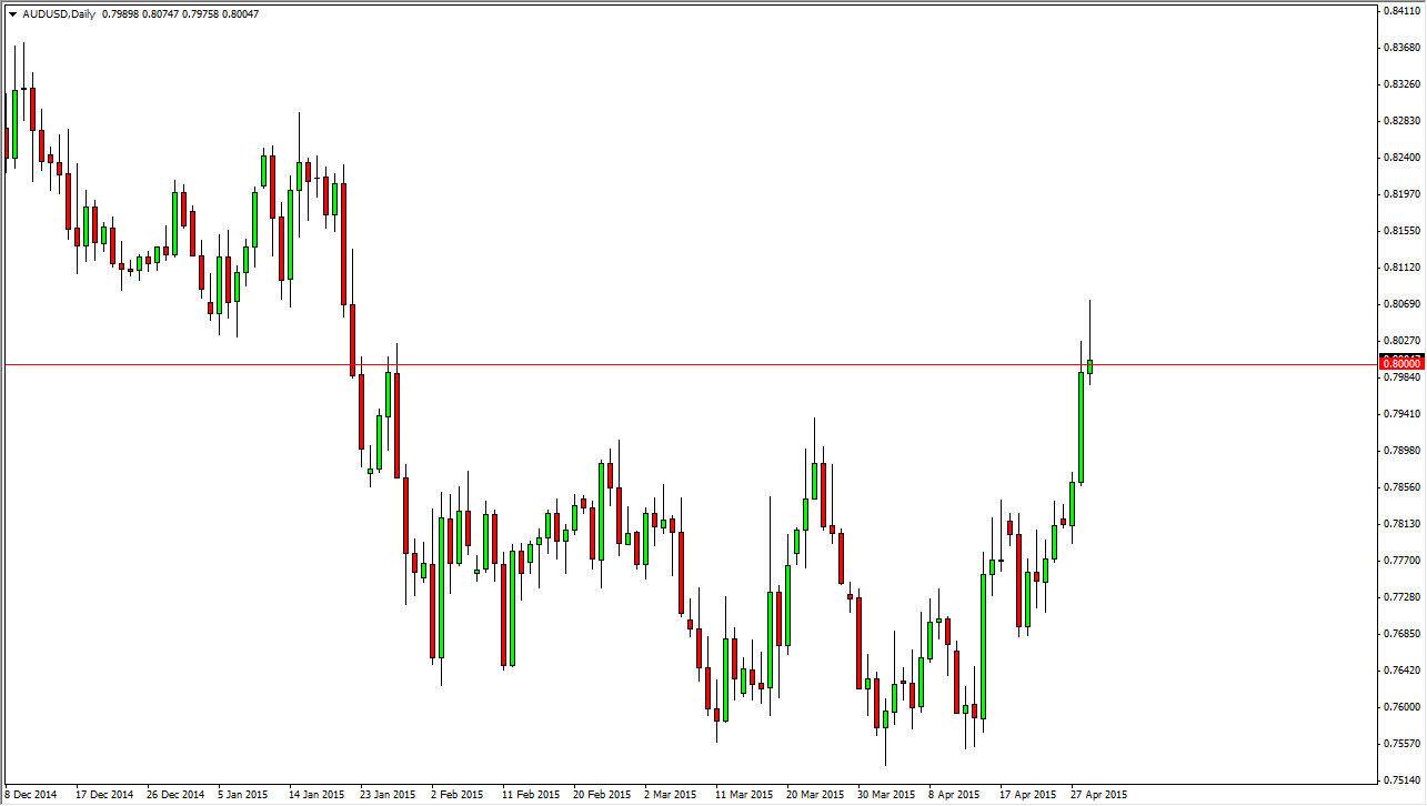 The AUD/USD pair formed a perfect shooting star during the session on Wednesday, after initially breaking out. The fact that this shooting star formed right at the 0.80 level has me intrigued, as it could be a very bearish sign. After all, this is a market that has respected this level more than once on the longer-term charts, so it would not surprise me at all to see the sellers step in here. I believe that a break down below the bottom of the shooting star would send this market looking for the 0.7550 level at the very least. I think that the Aussie dollar may find itself in a bit of trouble, because the gold markets are not helping at all. They did not look that hot during the session, especially after the Federal Reserve statement came out with almost no change.