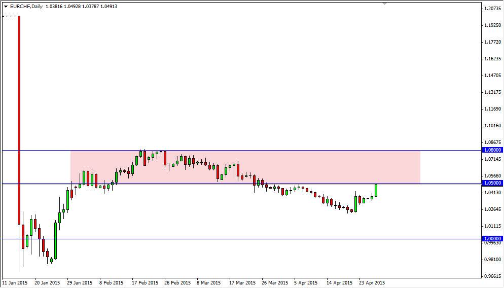 The EUR/CHF pair broke higher during the course of the session on Tuesday, slamming into the 1.05 level. This is an area where I see quite a bit of resistance, so we could see sellers step into the marketplace in this general vicinity. However, we are closing towards the top of the range which of course is a very bullish sign, so I think waiting until we get a daily close to make any type of trading decision is probably going to be the best thing to do at this point.
