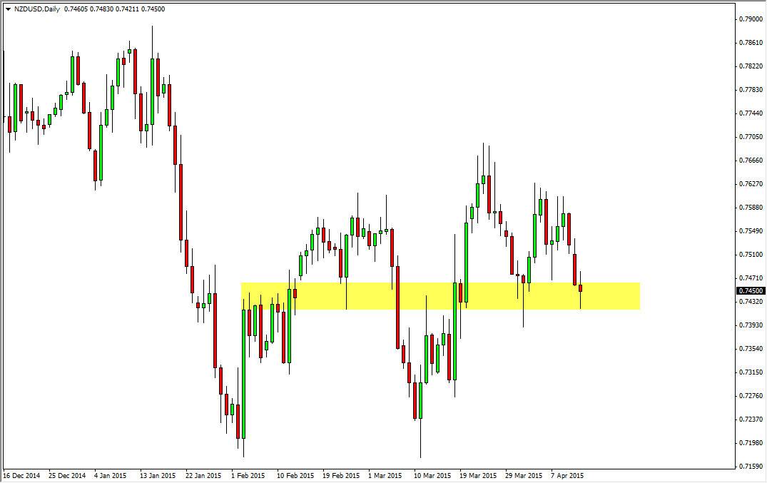 I believe that this market goes to the 0.72 level or possibly even lower given enough time. I also believe that the New Zealand dollar will continue to suffer at the hands of not only poor commodities, but the fact that in general the world is not exactly ready to take on the whole lot of risk. I think that ultimately this pair does break down but I am perfectly comfortable sitting on the sidelines and waiting for a selling opportunity. I would love to sell a resistive candle somewhere close to the 0.77 handle, and believe that the 0.80 handle above is the absolute ceiling in this market right now. Ultimately, it’s only a matter of time before we sell off, and therefore I am just simply looking for either resistive candles above, or a break of the range from Monday, either will do.