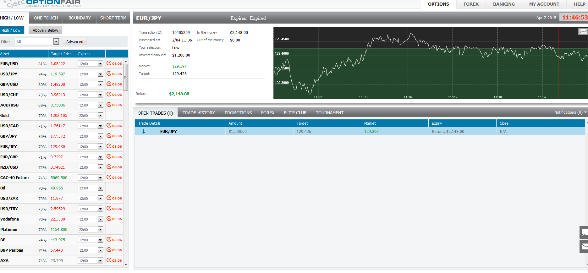 The target price for EUR/JPY at the buying time (11:36) was 129.426 for the expiration of 11:45. The Asset closed on 129.397 and I made $948.