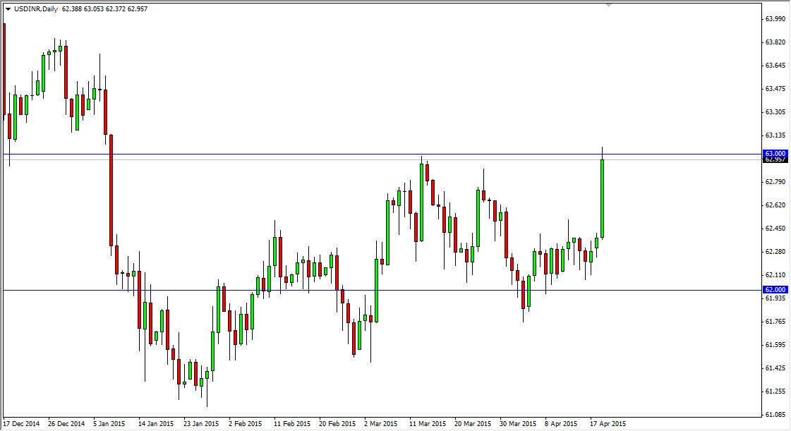 The USD/INR pair broke higher during the session on Monday as we crashed into the 63 level. This was the most recent high, and an area of significant support previously. The fact that we stopped at this level is not that big of a surprise, but quite frankly I believe that we are about to break out above it. After all, this is a very impulsive candle, and that normally means that you are going to see some type of continuation.