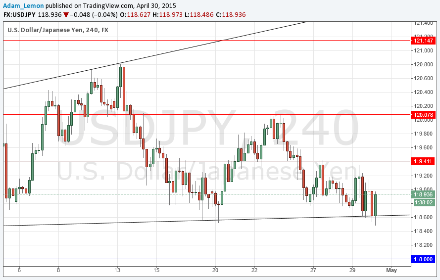 Yesterday’s signals suggested a long trade off the bullish trend line at 118.60 but there was no upwards momentum on the following hourly candle after the first bounce up off that trend line.