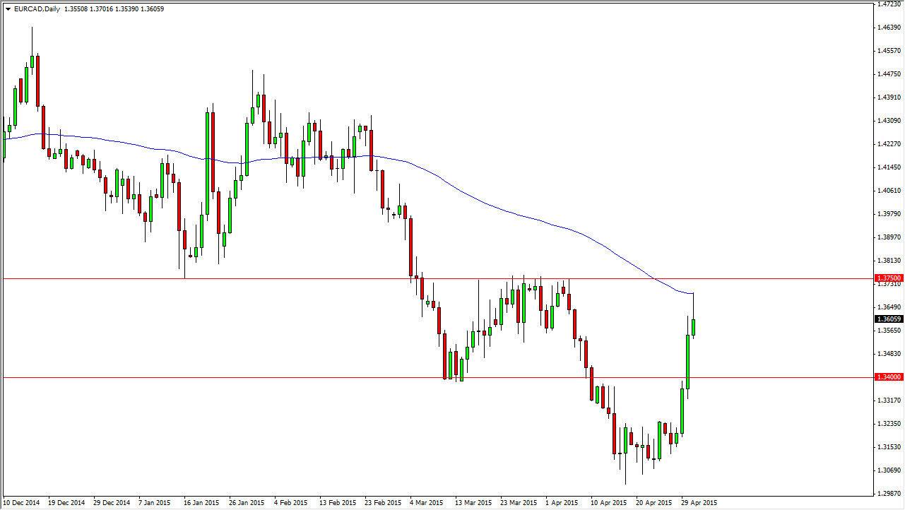 The EUR/CAD pair rose during the session on Friday as all EUR related pairs did. However, this market did the same thing most of the European currency related markets did, pulled back. By the time that the market closed, we ended up forming a shooting star. On this chart, I have plotted the 100 day exponential moving average. This is a favorite moving average by longer-term traders, and because of that I believe that a lot of them have been alerted to a potential selling opportunity. On top of that, it is at the 1.3750 level, an area that has been resistive in the past. Based upon the candle and the average, and of course the round number, I believe that the market is ready to start pulling back.