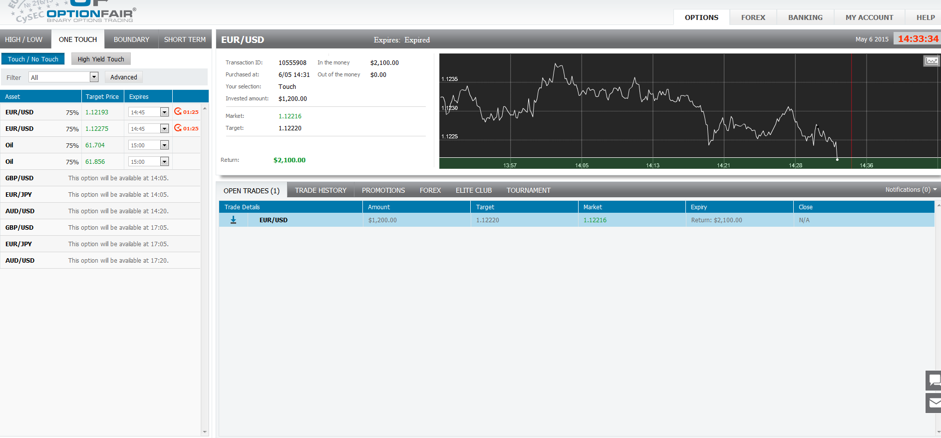I logged in the OptionFair™ binary options trading platform and I traded $1200 on the "Touch up" instrument. This kind of option has a return of 75% if the option touches the strike price prior to expiry, which means that if the signal is correct, I could get a return of $900 on my investment.