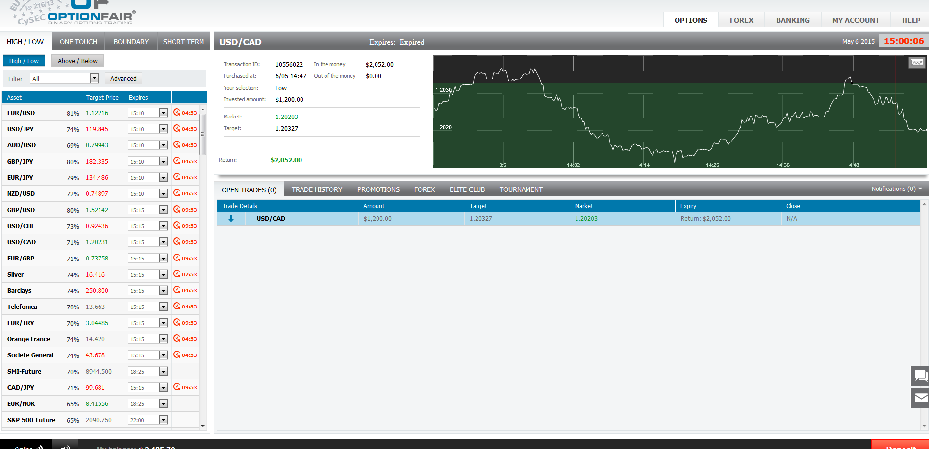 I logged in the OptionFair™ binary options trading platform and I traded $1200 on the "Low" instrument. This kind of option has a return of 7% so if the option will close below the target price, which means that if the signal is correct I could get a return of $852 on my investment.