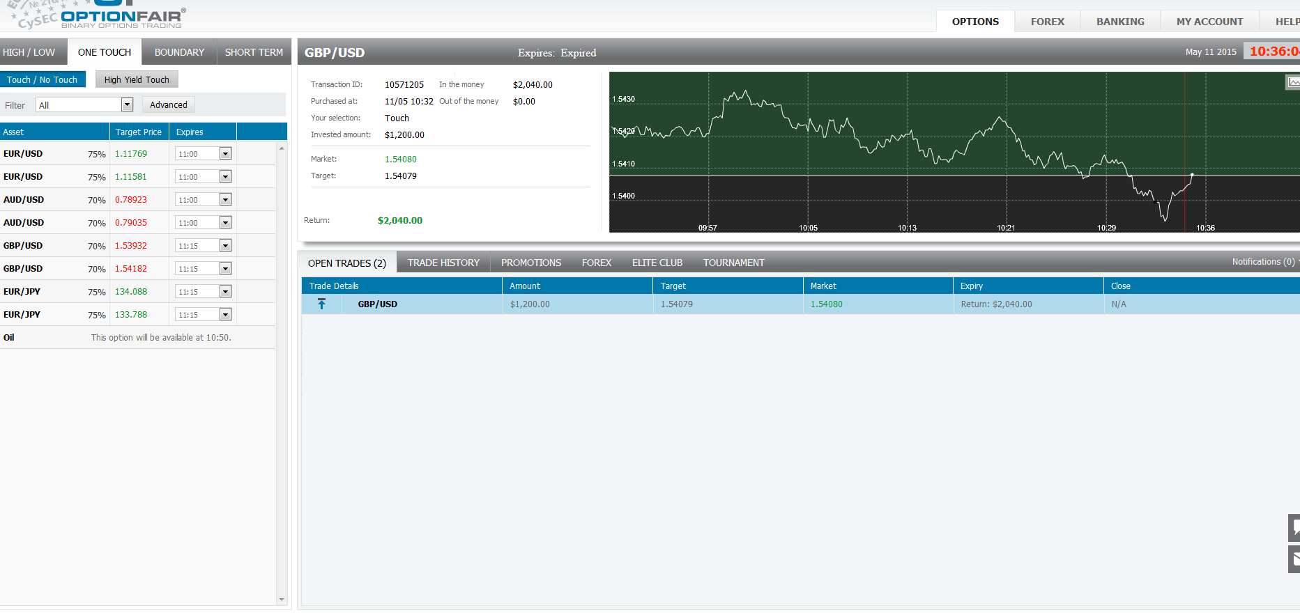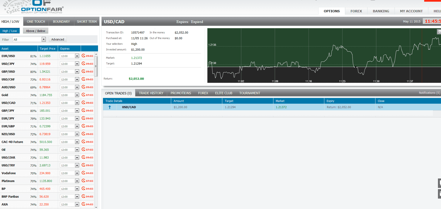I logged in the OptionFair™ binary options trading platform and I traded $1200 on the "Touch up" instrument. This kind of option has a return of 70% if the option touches the strike price prior to expiry, which means that if the signal is correct, I could get a return of $840 on my investment.