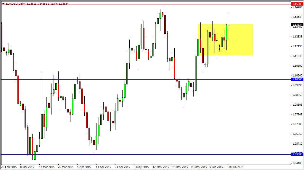 I am a longer-term buyer of the Euro in general, as I believe that the US dollar is starting to look like it may have topped out in general. The US Dollar Index looks like it is starting to soften up in general, and as a result the pair will more than likely breakout eventually. However, once we get above the 1.15 level it is very likely that it will be very explosive.