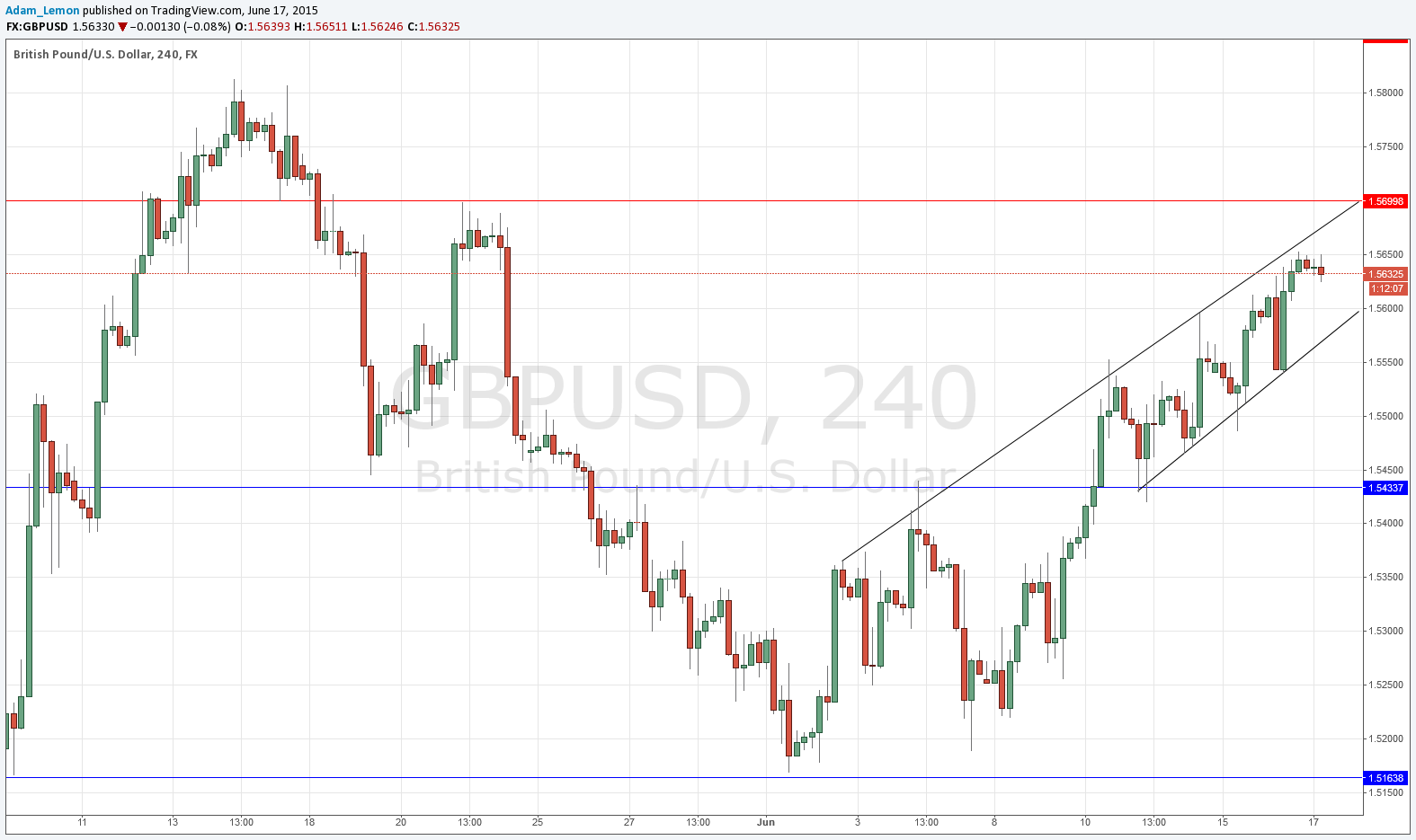 I forecast yesterday that there was a resistant zone from around 1.5650 stretching up to 1.5700 which would probably be hard to break. This is exactly what happened, with the price remaining within a fairly narrow bullish channel but unable to penetrate above 1.5650.