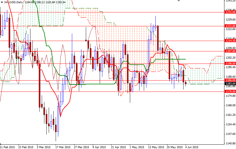 The market is hovering just above the 1283 level by the time I write my analysis and this area produced only a small bounce so far. On the upside, the initial resistance level stands at 1186 and 1190.33 but since the clouds on the daily and 4-hour time frames overlap, it makes more sense to think the 1190.33 - 1203 region as a whole. The bulls will need to pass through this area if they want to take over and tackle the resistance at 1207. Beyond that, sellers will be waiting around the 1214.50 level. Any failure to penetrate the clouds may put extra pressure on the market and drag prices back to the support around 1178/5 - an area that has attracted strong buying and held XAU/USD up since late March. If the bears picture this camp, then we could see a test of 1168/6.