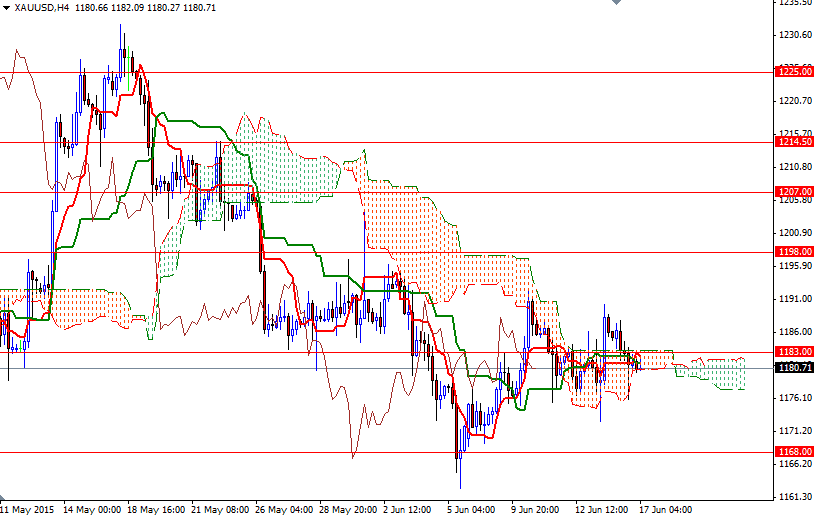 The market has been stuck between roughly the 1192 and 1168 levels for the last couple of weeks. Prices continue to feel bearish pressure from the (weekly and daily) Ichimoku clouds and negatively aligned Tenkan-Sen (nine-period moving average, red line) and Kijun-Sen (twenty six-day moving average, green line) lines but the bulls are trying to hold market above the 1168/6 area. As I pointed out in my previous analysis, until we leave this relatively tight range, it will be hard to hang onto a trade for a reasonable length of time. To the upside, there are hurdles on the way such as 1183.41 and 1191. If the market breaks through, it looks like XAU/USD will head towards 1202 - 1198. On the other hand, it is quite possible that the pair will continue its bearish tendencies if prices drop below the 1175/4 area. In that case, it is likely that the market will be testing the 1168/6 area afterwards. Breaking below this support would open up the risk of a move towards 1157.