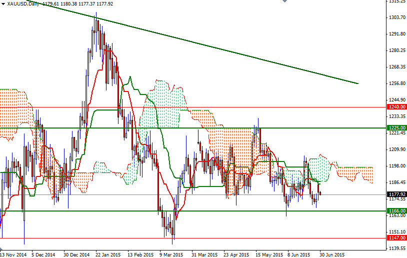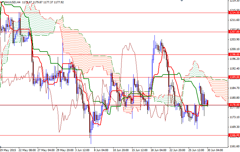 The precious metal opened with a gap to the upside yesterday as the likelihood of Greece defaulting on its debt repayment this week spiked dramatically. The European Central Bank's decision to freeze funding to Greek banks pushed down stocks on major world markets and drove up buying of safe-haven gold. The XAU/USD pair initially rallied to $1187.73 but gave up some of those gains later in the session and closed at $1179.61.