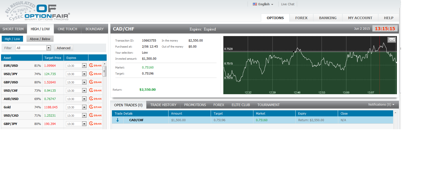 I logged in the OptionFair™ binary options trading platform and I traded $1500 on the "Low" instrument. This kind of option has a return of 70% so if the option will close below the target price, which means that if the signal is correct I could get a return of $1050 on my investment.