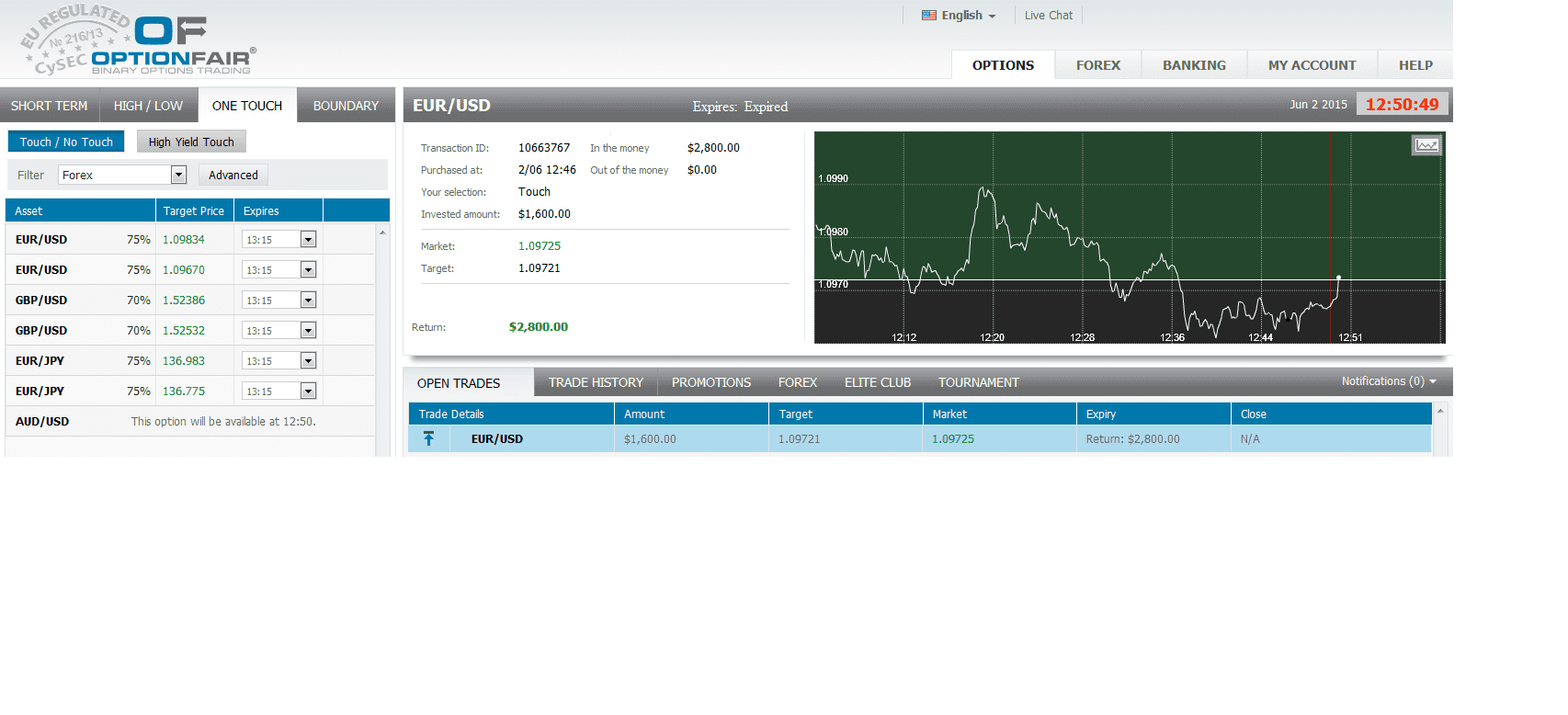 I logged in the OptionFair™ binary options trading platform and I traded $1600 on the "Touch up" instrument. This kind of option has a return of 75% if the option touches the strike price prior to expiry, which means that if the signal is correct, I could get a return of $1200 on my investment.