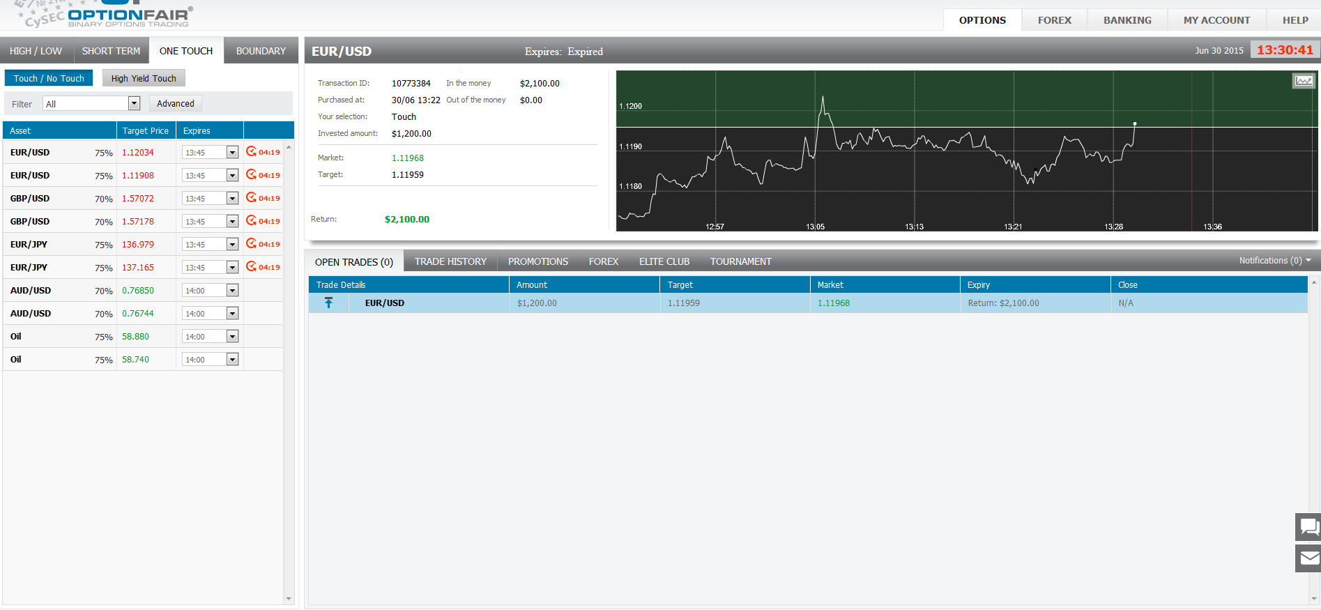 I logged in the OptionFair™ binary options trading platform and I traded $1200 on the "Touch Up" instrument. This kind of option has a return of 75% if the option touches the strike price prior to expiry, which means that if the signal is correct, I could get a return of $900 on my investment.