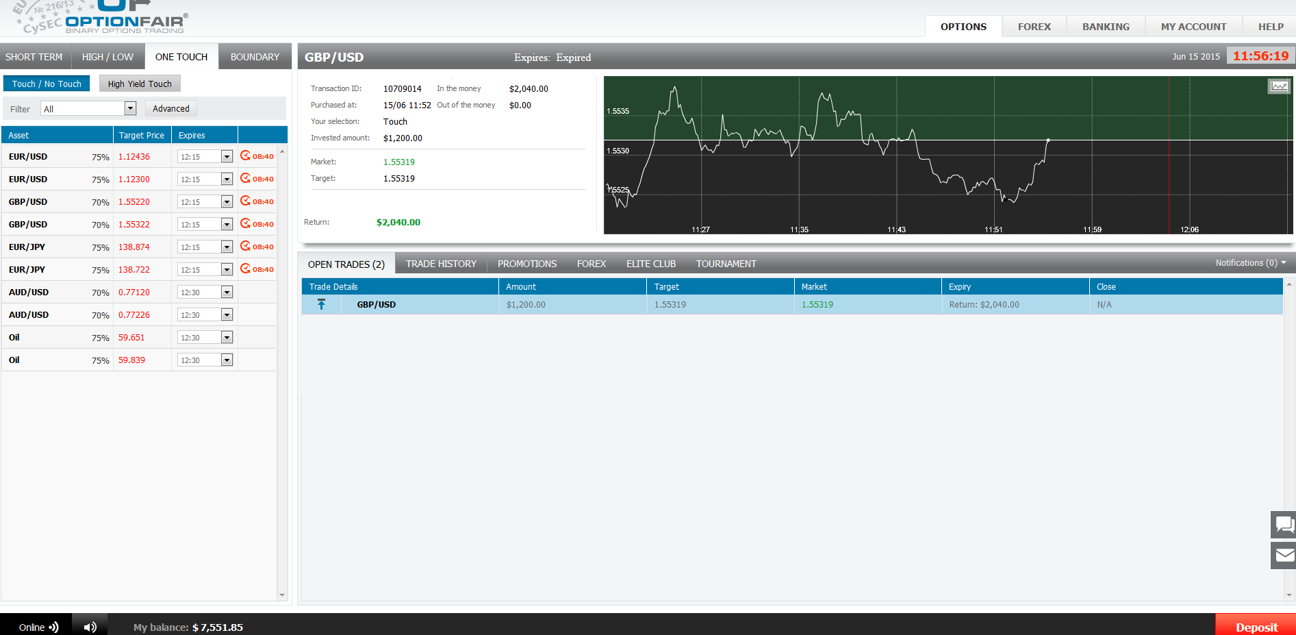 The price for GBP/USDat the buying time (11:52) was 1.55244 and the target price was 1.55319 for the expiration of 12:15. The asset did touch the target price at 11:55, and I made $900.