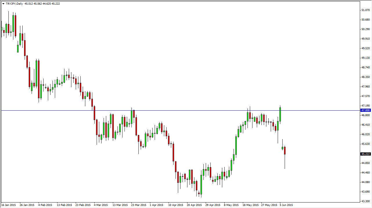 The TRY/JPY pair is one of my favorite pairs to trade because of the large swap offered for going long. Ultimately, this is a market that a lot of “carry traders” prefer as there is plenty of money to be made while waiting for a move higher. The fact that we gapped lower suggests that there are a lot of fears due to the Turkish elections. For those of you who do not know, there seems to be a bit of a struggle to come up with an idea as to how to form a coalition government in Ankara. Because of this, it will continue to have people concerned about the Turkish lira itself.