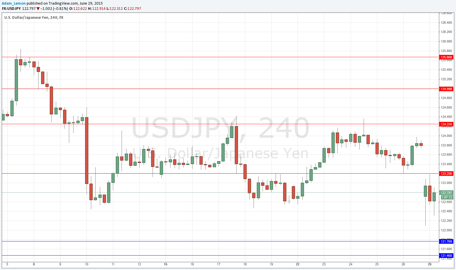 A knock-on effect of the Euro crisis made the price of this pair gap down below the new flipped support/resistance at 123.20 overnight. The price then held as resistance. It is there, but might not be very reliable for the rest of today as it would touched just a few hours ago.