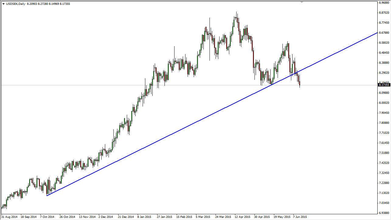 Even if we do break down cleanly, I think that we will have quite a bit of volatility going forward, and as a result you will have to be able to handle a longer-term trade if you start shorting. If we break above the uptrend line again, then I think that would be very bullish sign and I might be able to start buying at that point. However, I have to mention that the USD/NOK pair did pretty much the same thing during the session as well, and the Scandinavian currencies do tend to move in tandem for the most part, even though the Norwegian krone is considered to be a petroleum influenced currency.