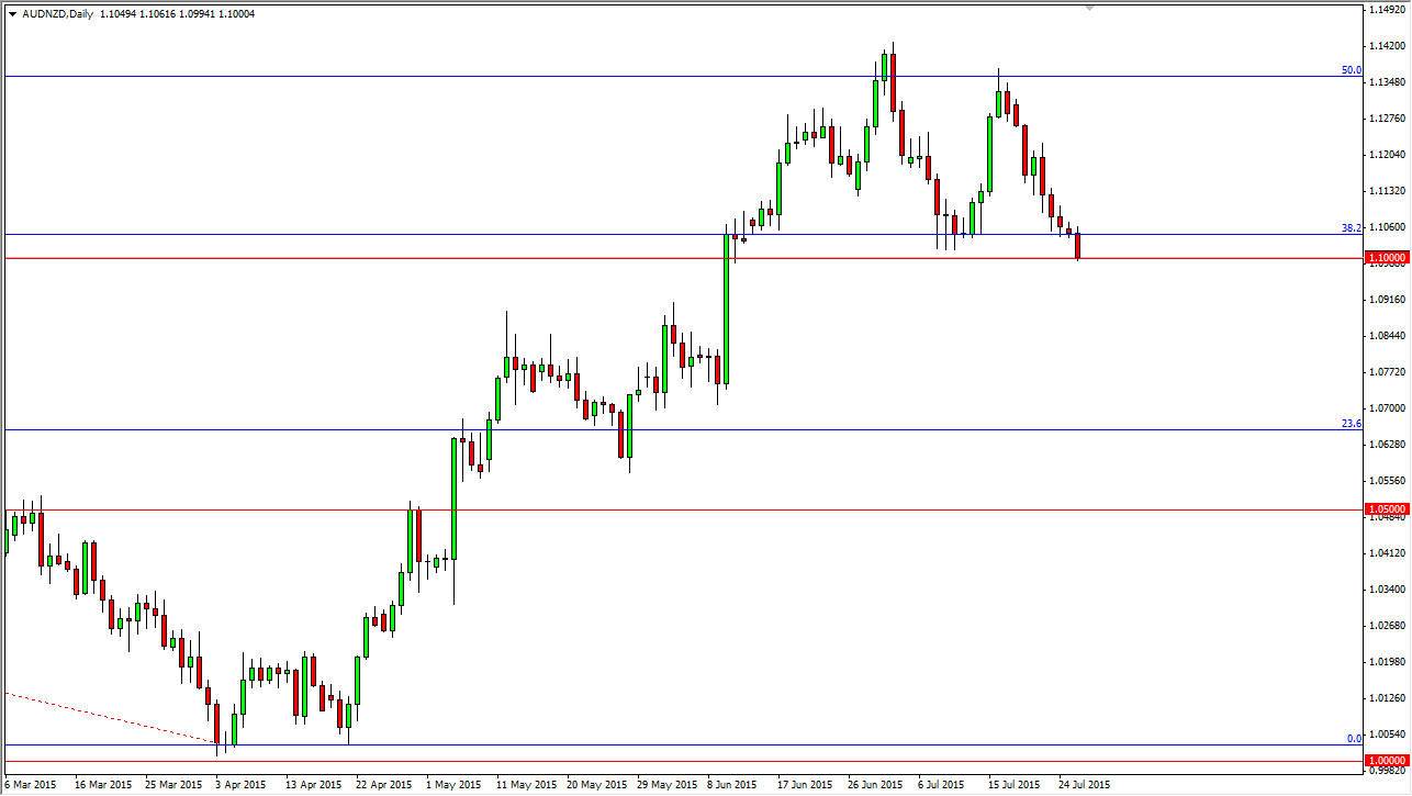 The AUD/NZD pair fell during the session on Monday, testing the 1.10 level. This of course is a large, round, psychologically significant number, and as a result I believe that if we can continue a little bit lower, the market will probably drop to the 1.0850 level. However, when you look at the larger charts, we recognize that the recent high that we had head was the 50% Fibonacci retracement level. In other words, it is possible that we continue to go much lower than that.