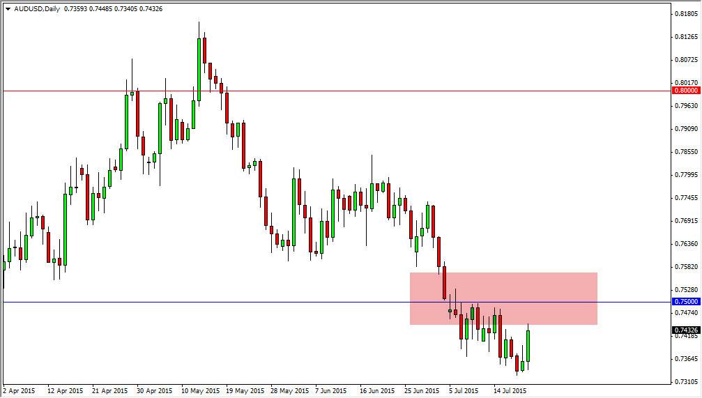 The AUD/USD pair initially fell during the course of the session on Tuesday, but found enough support to turn things back around to climb much higher. By doing so, we reach towards the 0.7450 level, which of course is a harbinger for the 0.75 level which we find as so much more resistive. On top of that, the 0.75 level extends all the way to the 0.76 level as far as resistance is concerned. With that, I believe that this market will continue to go lower, but we are simply getting a “relief rally” at the moment.