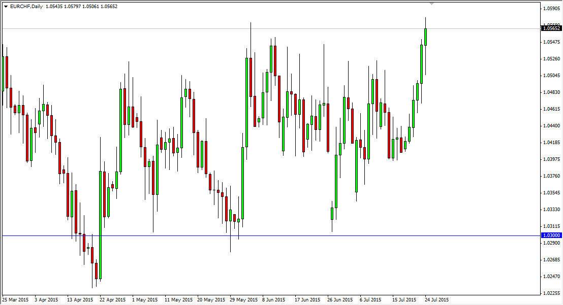 This market has seen an impulsive move higher recently, and as a result I think that the buyers are finally starting to try to get the upper hand. On top of that, it has recently been announced that the Swiss National Bank has been buying Euros in order to try to devalue the Swiss franc. With that being the case, the market looks as if it is going to continue to go higher, and a move above the 1.06 level should be yet another sign of bullishness in this particular pair.