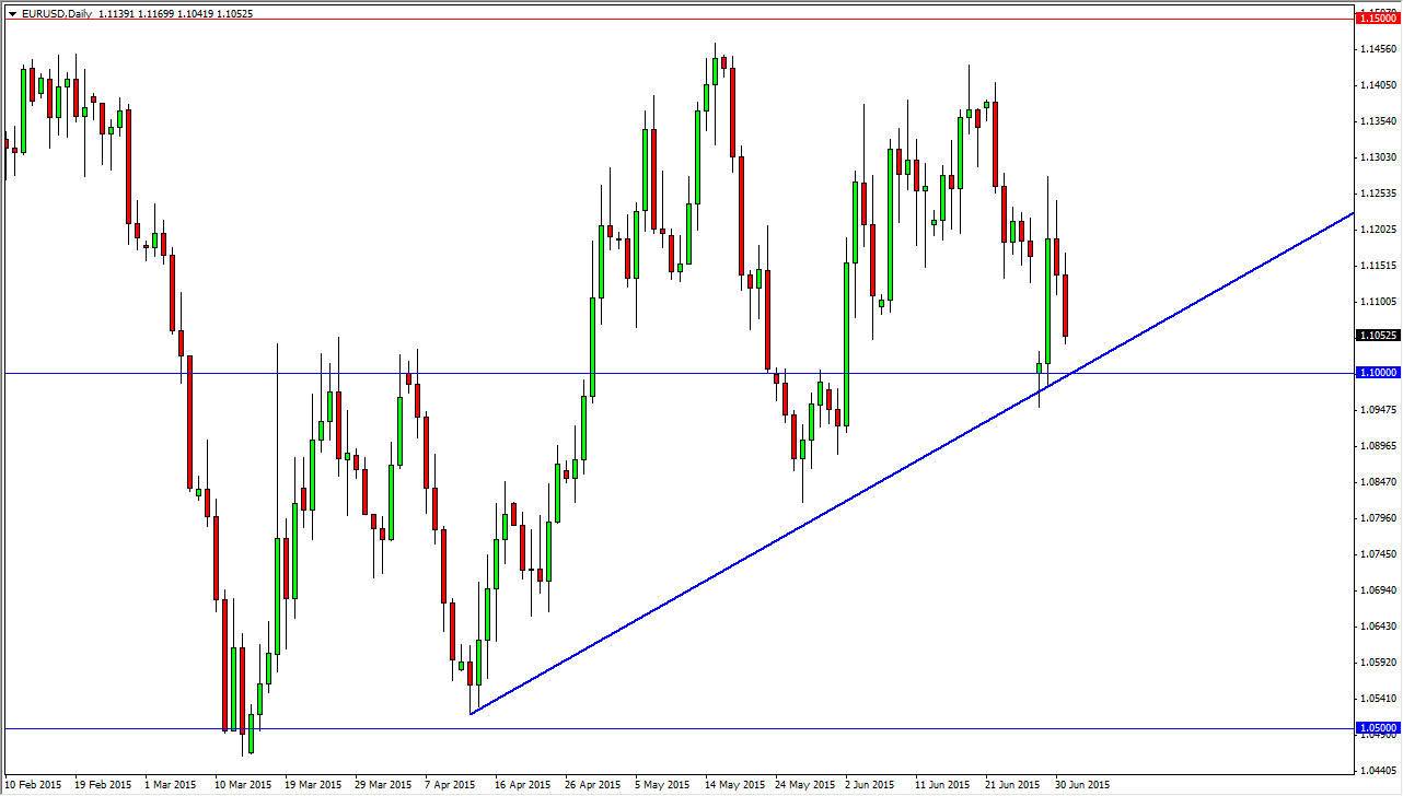 Remember, today is employment number announcement out of the United States as the Independence Day holiday will get started during the day on Friday with most people being away from work. Because of this, it’s very likely that the announcement will be the main thing we focus on. Also, we have the Greek referendum over the weekend on Sunday, and that of course will have a lot to do with what this particular currency pair does. At this point though, it looks like there are people willing to bet on the Euro longer-term. So even if the referendum says that the Greek public isn’t willing to go along with the financial demands, I believe that we will find the bottom after that as well.