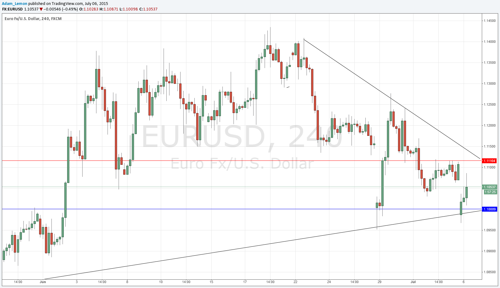 This pair opened right on the long-term bullish trend line last night which was confluent with the whole number support at 1.1000. It held, and the price moved up, buoyed by the news that it seems that the Greek government and its Creditors are going to make a serious attempt to reach a deal over the coming days.