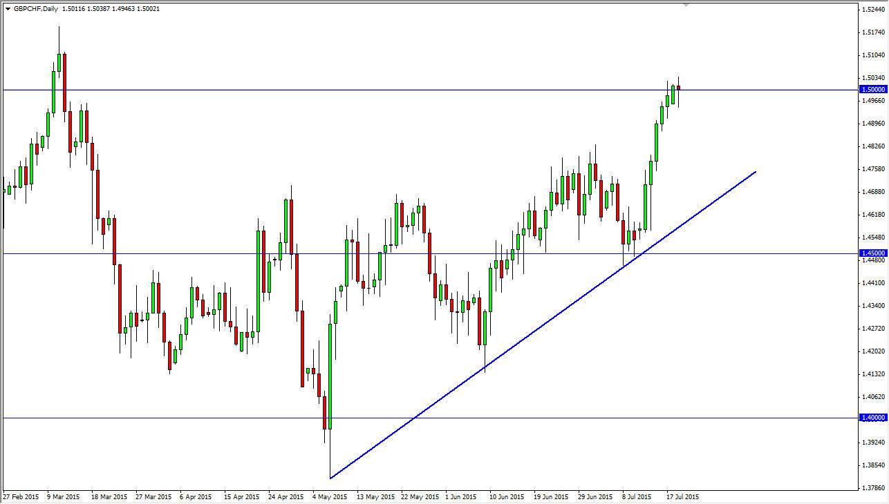 The GBP/CHF pair pulled back during the session on Monday, but found enough support below the 1.50 level to turn these back around and form a hammer. This is a very interesting candle for me, because a hammer is more than likely going to be supportive. However, if you break down below the bottom of the hammer, that is technically a “hanging man”, a very bearish candle pattern.
