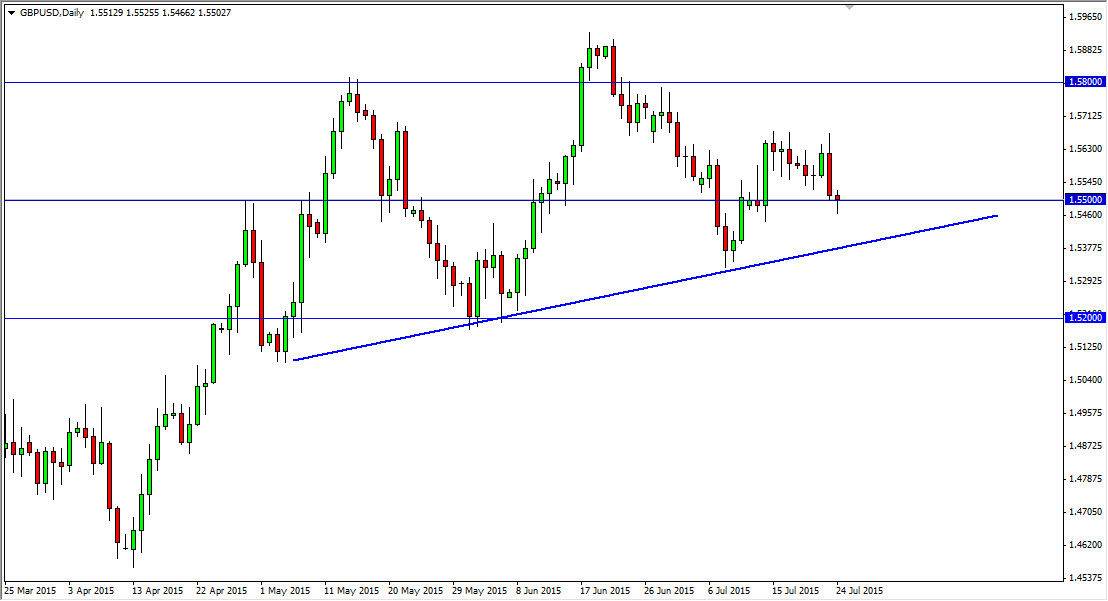 The GBP/USD pair fell initially during the course of the session on Friday, and as a result dropped below the 1.55 handle. The area below there should be massively supportive though, and as a result we feel that the markets probably will turn back around and start going higher again. The fact that we formed a hammer of course is a bullish sign, and of course there is a significant uptrend line just below. Ultimately, the market should continue to go much higher, but in the first place we will probably aim for the 1.57 level first.