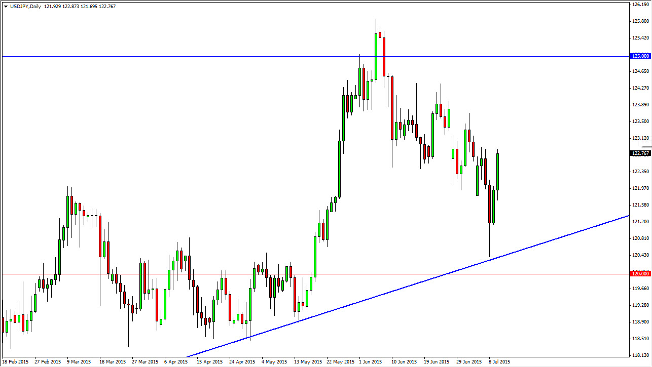 The USD/JPY pair broke higher during the course of the session on Friday as we got wind of a potential solution to the Greek debt crisis being worked out. If that’s the case, the markets should start finding quite a bit of risk appetite going forward, and that should send this pair higher as it does tend to be very risk sensitive. With that, I think that pullbacks are buying opportunities, and that it’s only a matter of time before we finally get that move higher than I’ve been waiting on. As you can see on the chart, there is an uptrend line below that has held as support, and I think we will now reach towards the 125 level.