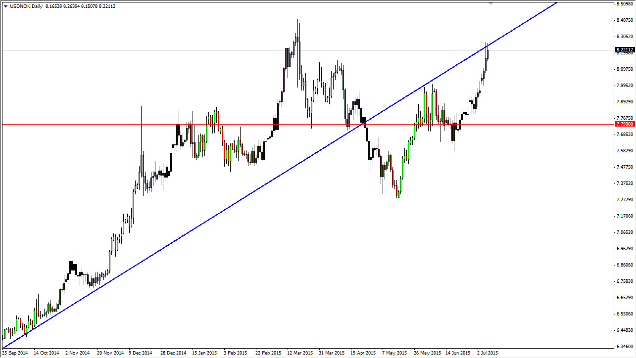 The USD/NOK pair is one that a lot of you unfortunately don’t trade. However, I implore that you should as it is such a pure were play to the oil markets. Quite frankly, there’s very little need for the Norwegian krone unless you’re looking at crude oil. The way the crude oil markets have behaving lately makes this a very interesting market as far as I can see. We currently find ourselves near the 8.22 handle, and as a result we are getting close to the recent highs.
