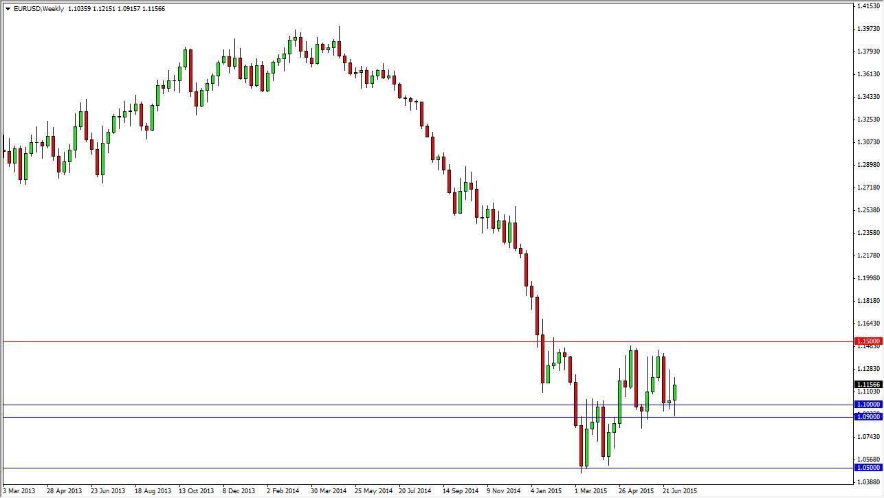 The GBP/USD pair broke down during the course of the week, dipping below the 1.55 handle. However, we bounced enough to form a hammer and it now looks as if the market is ready to rally. I believe that if we get any type of good news out of Greece, the British pound will continue to go much higher and perhaps reach towards the 1.58 level. I have no interest in selling this currency pair the moment.