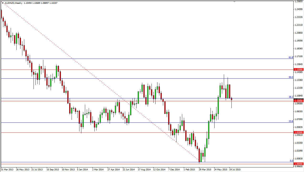 If we break higher, and above the top of the hammer, I feel the market then goes back to the 50% Fibonacci retracement level. The 1.135 level would be what we would be aiming for, and at that point in time I would be buying this pair going forward, on the dips as the market still would be volatile, but it would certainly would be a fairly positive sign. In the meantime, quite frankly I think it’s just a matter which way we break out of this range in order to decide where this month goes. Even mind that August is a very illiquid trading environment though, so quite frankly this could be a real sleeper for the next several weeks.