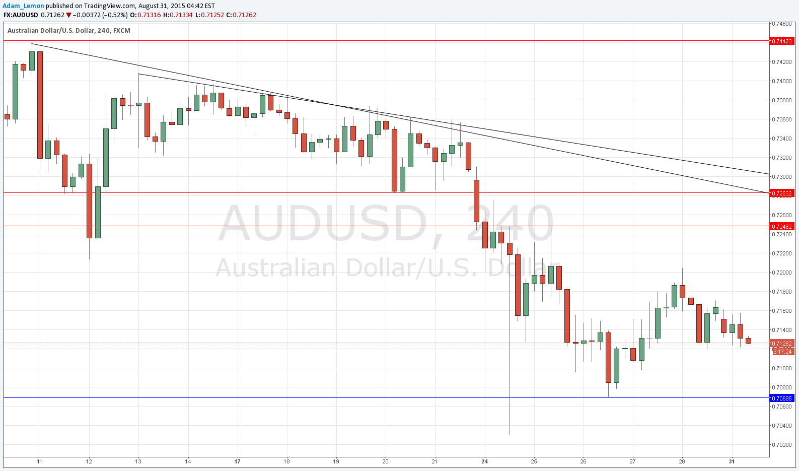 There is probably local resistance above at around 0.7200, and stronger resistance above that with a nice confluence of a resistive zone and bearish trend lines at around 0.7280. A news spike up there later could be a really great shorting opportunity.