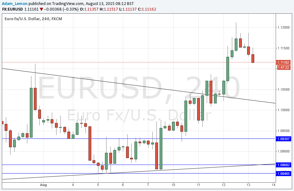 I wrote yesterday “I do not see any good resistance before 1.1292 and there is plenty of bullish momentum, so the line of least resistance looks clearly upwards.” This was a good forecast of what was to happen as we had a strong upwards move. Of course after such a strong move, it is not a surprise the USD then comes back overnight. It is hard to say what will happen next as we are quite far from either good support at the trend line or the next solid resistance at 1.1292, so we may chop around. There is probably resistance before 1.1292, most notably at 1.1250, but it looks unpredictable.