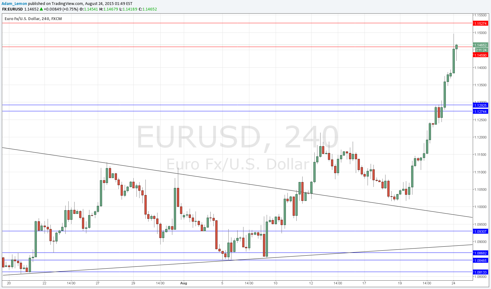 Surprisingly, as the market opened in Asia last night, the price again rose strongly, peaking just under the key psychological level of 1.1500. At the time of writing, the price is just under the anticipated resistance level of 1.1459. We are at a logical point for the price to pull back now, but with stocks selling off heavily and all the market turbulence going on, it seems that anything might happen.