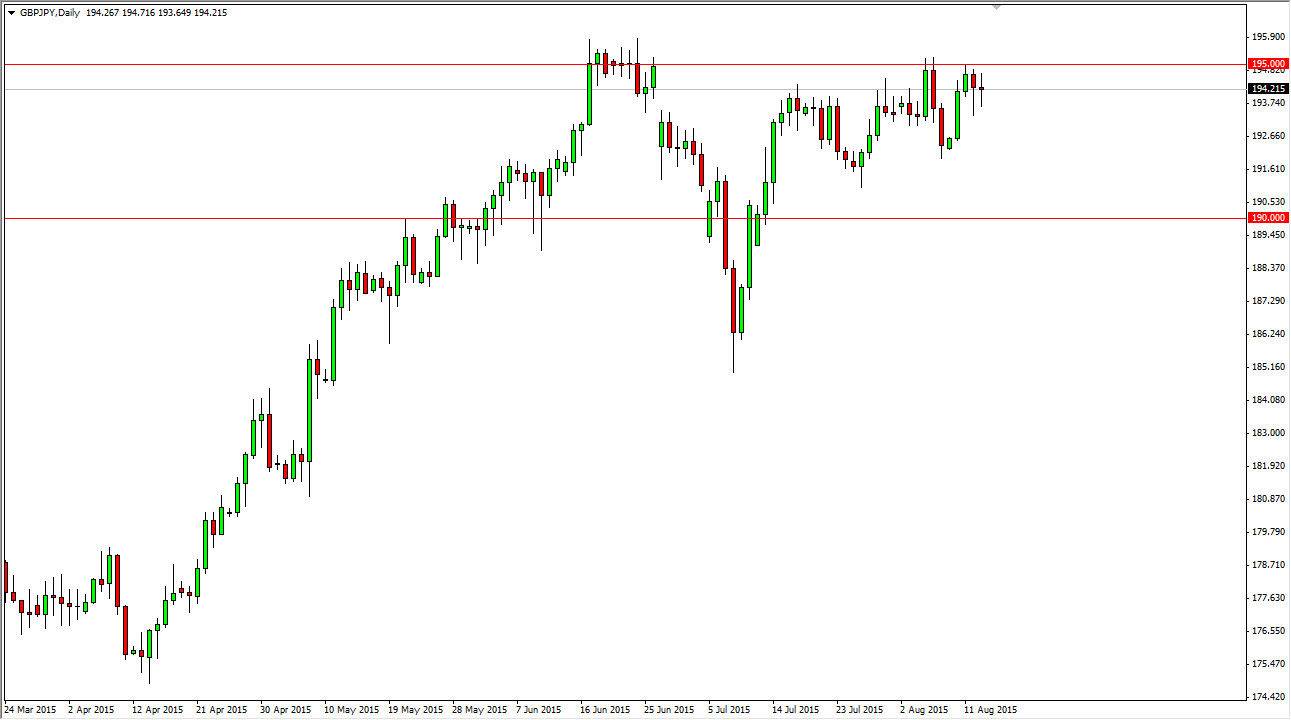 The GBP/JPY pair went back and forth during the course of the session on Thursday, bouncing just around the 195 handle. We are just below there though, so the market is trying to build up momentum in my opinion to break out finally. If we get above the 195 handle, this market should go to the 200 level next. After all, the British pound is doing fairly well against most currencies, while the Bank of Japan continues to work against the value the Japanese yen in general. I think this is a bit of a “perfect storm” at the moment, and eventually we will get the upward momentum that I am anticipating.