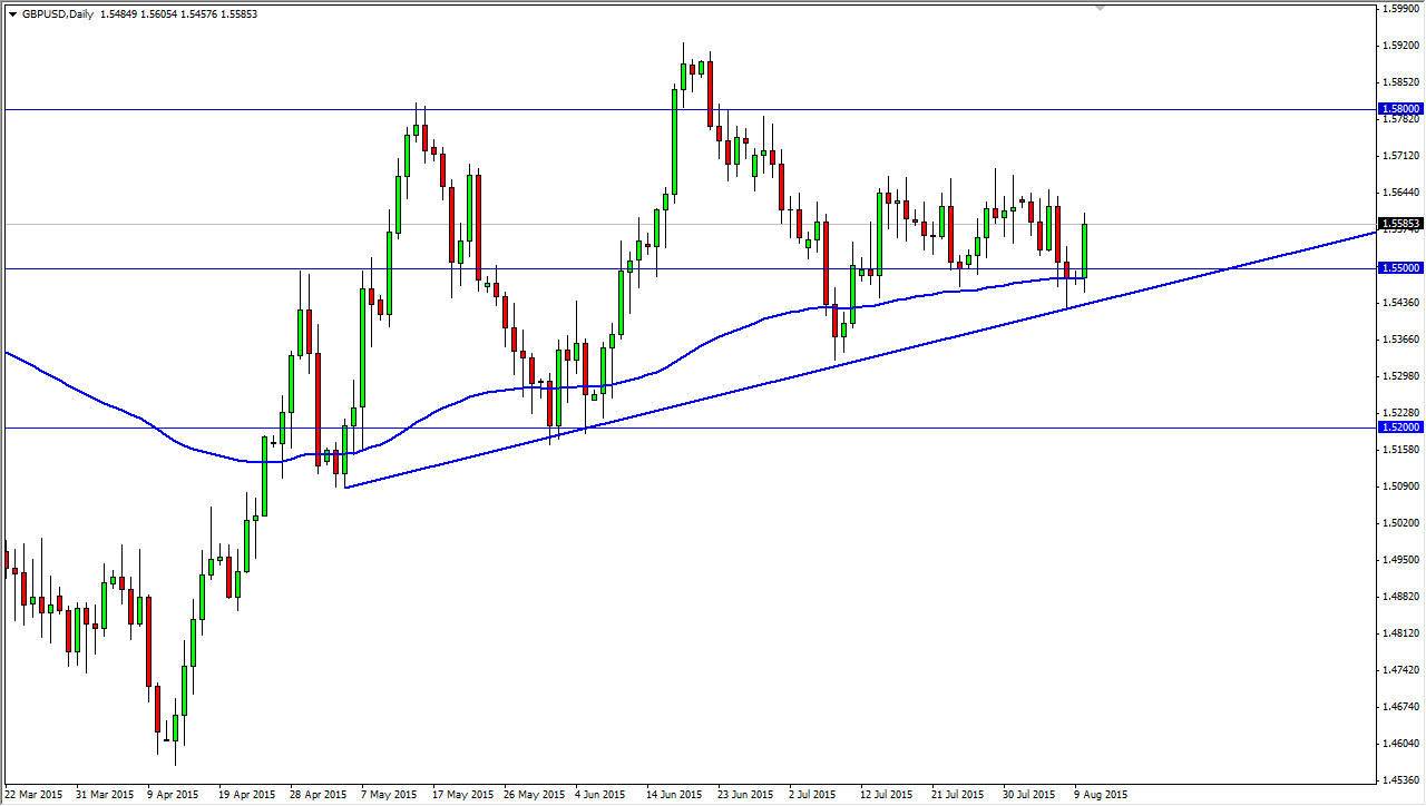 The GBP/USD pair initially tried to fall during the course of the day on Monday, but as you can see the uptrend line has held true. Because of this, I believe that this market is well supported below. On this chart, I have the 100 day exponential moving average as well, and that of course is a very positive sign. The 100 day exponential moving average is one of the favorites of long-term traders, so at this point in time I believe that larger traders are starting to come into this market and pick up the British pound based upon “value.”