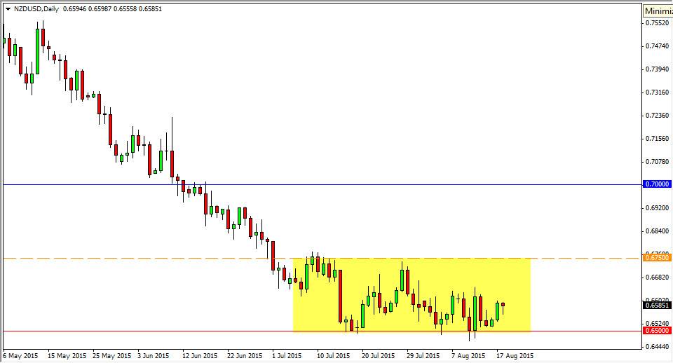 The NZD/USD pair initially fell during the course of the session on Tuesday, but as you can see found enough support to turn things back around and form a hammer. This of course is a very bullish sign, but ultimately I still believe that this market is very much in a downtrend, and as a result I feel that it’s only a matter time before the sellers come back into this marketplace. As you can see, I have a yellow dashed line at the 0.6750 level, and I think that level is very important.
