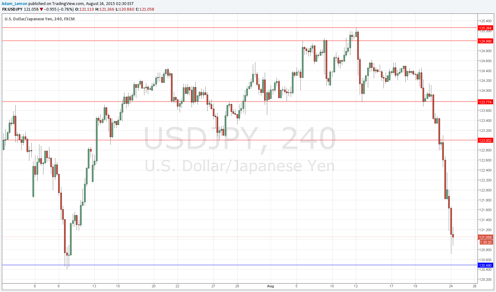This pair has fallen very sharply as the concern over a China-led slowdown has the heavy impact of strengthening the Yen. With a weak U.S. dollar right now, it makes for something of a perfect storm. The price has sliced through support like a knife through butter, but may be bottoming out now as it approaches key support close to 120.49 and fails to make any new lows for a few hours at least.