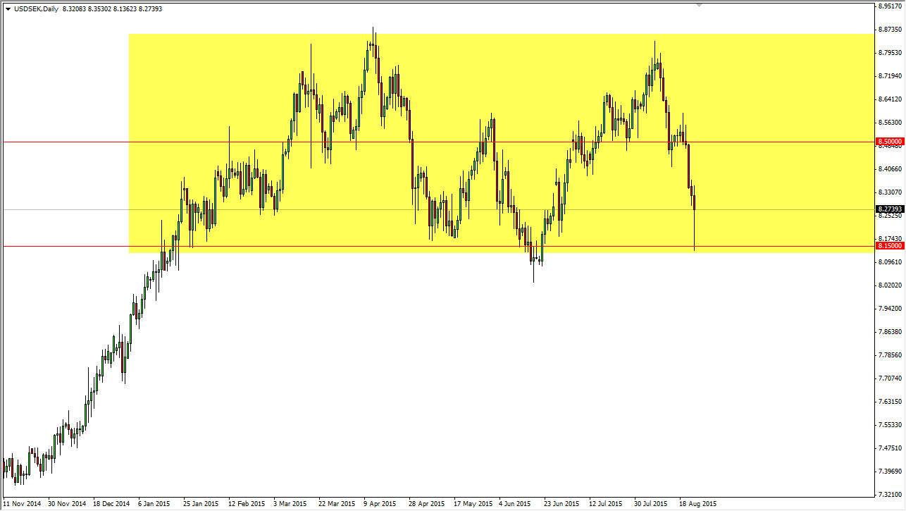 The US dollar was most certainly oversold during the session, and I have to wonder whether or not it was an algorithmic trading at its worst. After all, it was across the board and without any real sense. I believe that the market is currently going to find the 8.15 level to be massively supportive, just as I think the 8.50 level will be massively resistive. I also think that this is a bit of an illiquid pair, so that of course can exacerbate these types of moves.