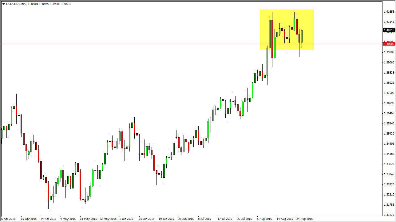 The USD/SGD pair initially tried to break down below the 1.40 level during the day on Wednesday, but as you can see we broke higher. In fact, at the end of the day we are testing the top of the hammer from the Tuesday session which of course is a very bullish sign. That should have buyers coming back into this marketplace in trying to push the pair to the 1.4160 level again. The Singapore dollar of course is a financing currency when it comes to construction and large projects in Asia, as Singapore is essentially known for its banking sector. This is a simple play on North American versus Asian economies at the moment, and as that is the result it makes sense that the US dollar continues to strengthen.