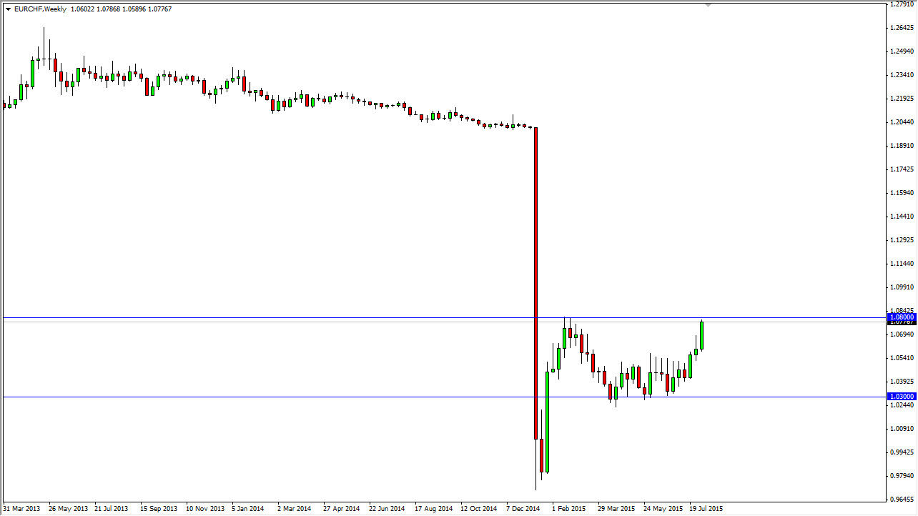 The USD/CAD pair went back and forth during the course of the week, but as you can see ended up forming something akin to a shooting star. Because of this, we may get a little bit of a pullback but quite frankly I see massive amount of support between the 1.30 level and the 1.28 level below there. At this point in time, I think if we see a pullback, this will prove itself to be a buying opportunity in the end. With that, I am going to be patient and wait for supportive candles in order to start going long again.